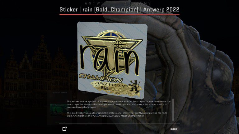 As assinaturas dos jogadores da FaZe são iguais, mas a Valve adicionou novos elementos, como a palavra “Champion”. Todos os items relacionados com o último Major estão em promoção, relembrando que uma percentagem das vendas será revertida para as equipas participantes.