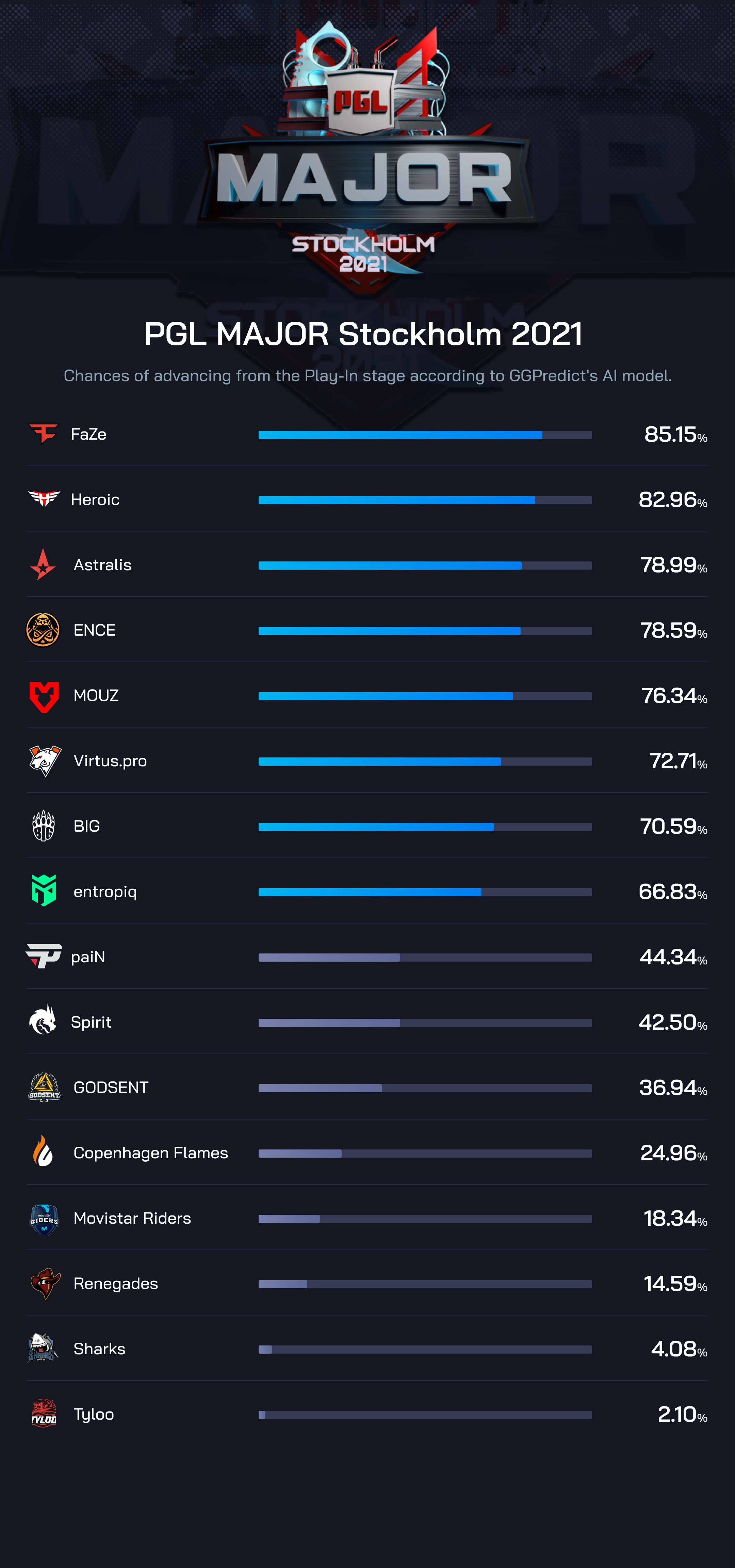 A liderar o pelotão está FaZe e Heroic, que se apresentam com uma taxa de sucesso acima dos 80%. Astralis, ENCE e MOUZ fecham o top 5, com 75% de probabilidade de apuramento, e a fechar o lote de qualificados estão Virtus.pro, BIG e Entropiq.