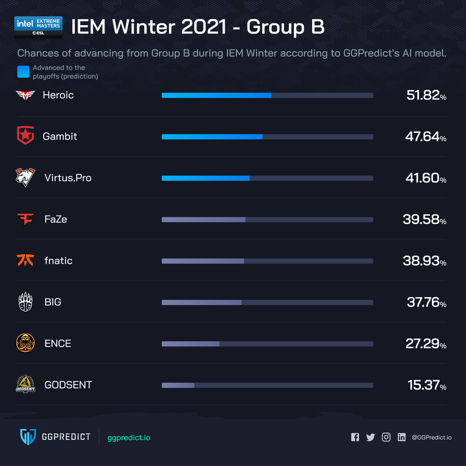 Segundo esta tecnologia, as três equipas do Grupo A que vão chegar aos playoffs são G2, Vitality e OG, enquanto que no Grupo B, Heroic, Gambit e Virtus.pro são compõem o trio com mais probabilidade de ultrapassar a primeira fase do IEM Winter 2021.