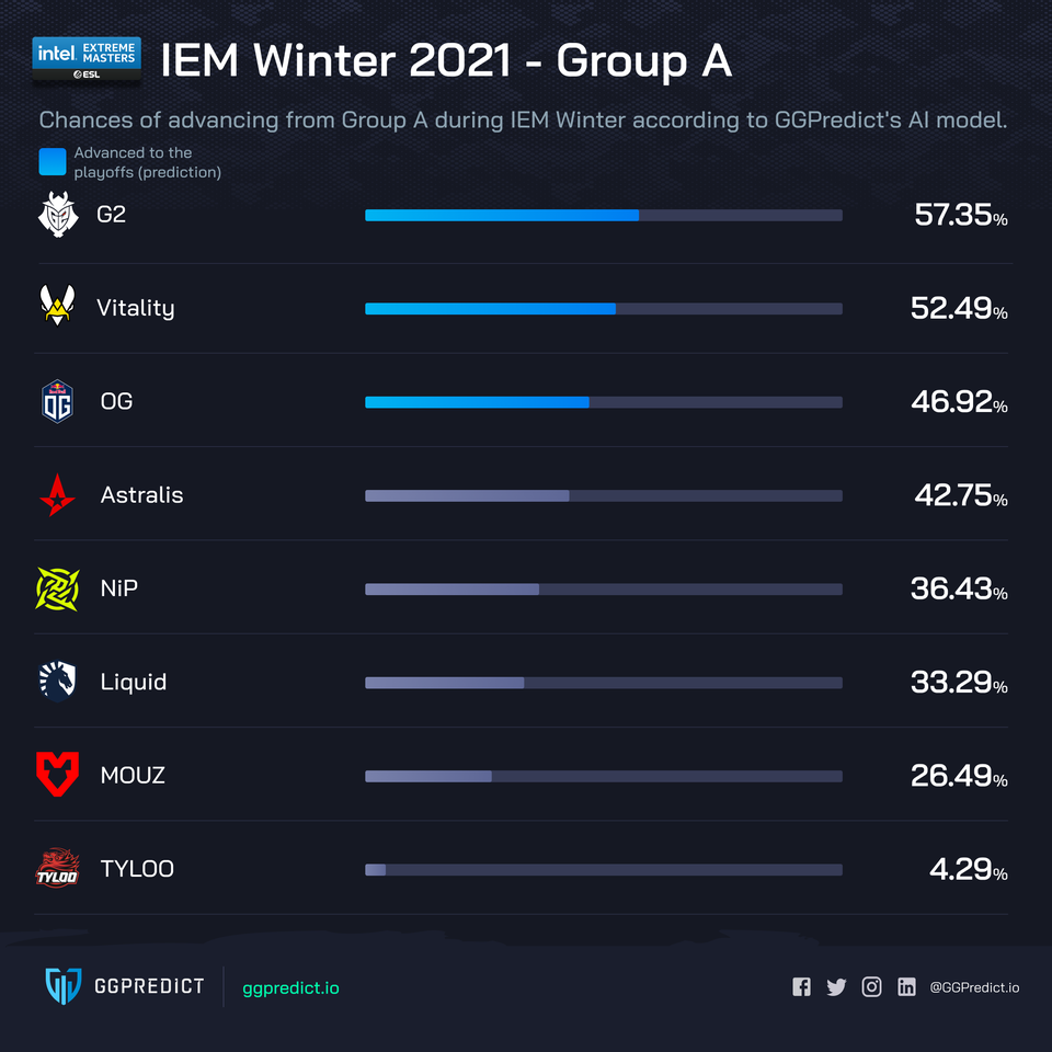 Segundo esta tecnologia, as três equipas do Grupo A que vão chegar aos playoffs são G2, Vitality e OG, enquanto que no Grupo B, Heroic, Gambit e Virtus.pro são compõem o trio com mais probabilidade de ultrapassar a primeira fase do IEM Winter 2021.
