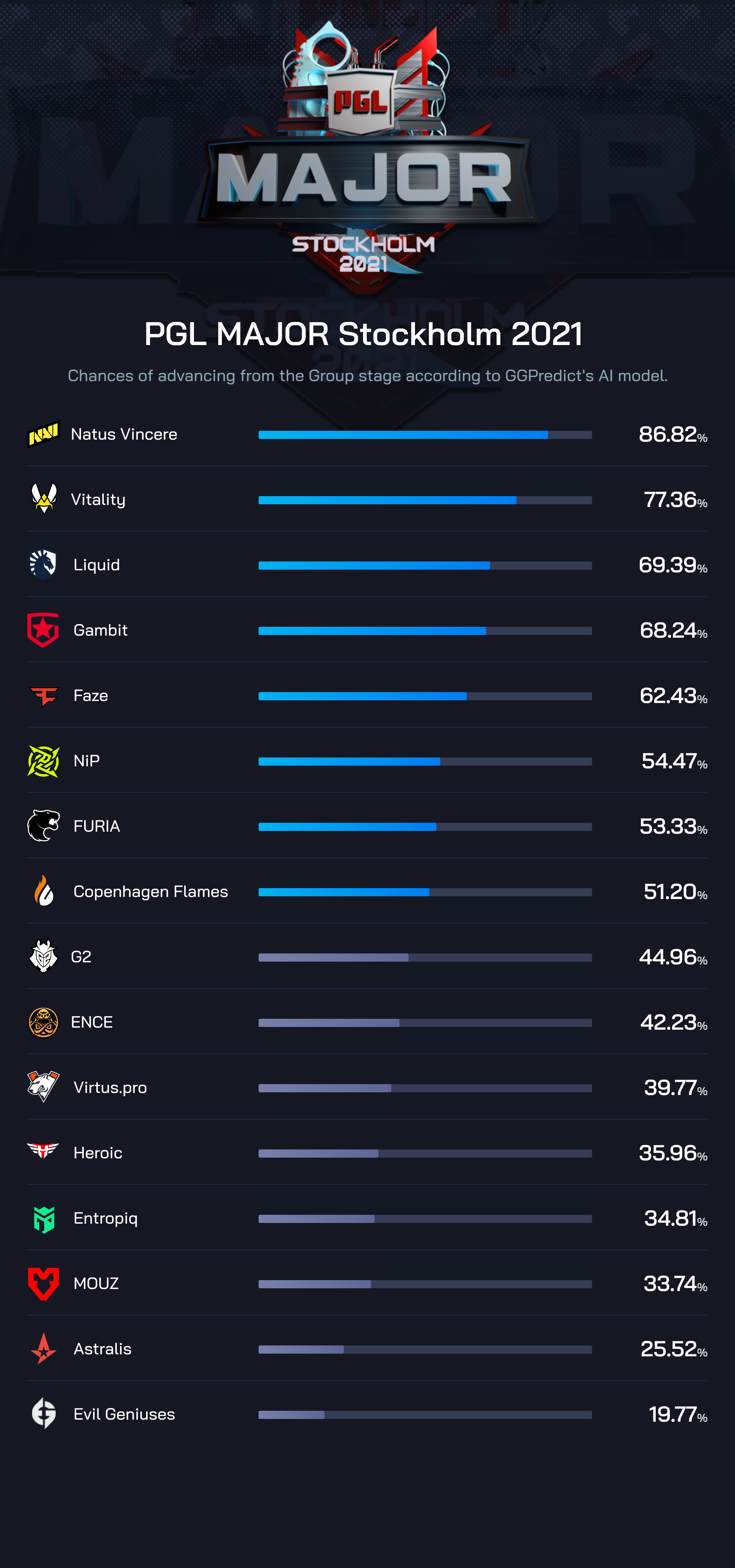 Das 16 equipas presentes, NAVI e Vitality aparecem como favoritas – um troféu que continua a escapar a Oleksandr "s1mple" Kostyliev – com mais de 75% de probabilidade. Liquid e Gambit também se apresentam com uma probabilidade alta de ultrapassar esta fase.