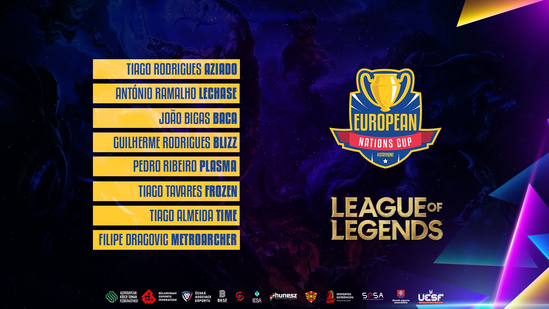 No dia 1 de Maio, a Federação Portuguesa de Desportos Eletrónicos (FPDE) anunciava junto de outras 11 Federações Europeias a participação nos torneios solidários #StayHome European Nations Cup jogados em League of Legends, eFootball Pro e de Counter-Strike: Global Offensive, com jogos sujeitos a convocatória e outros a qualificadores.