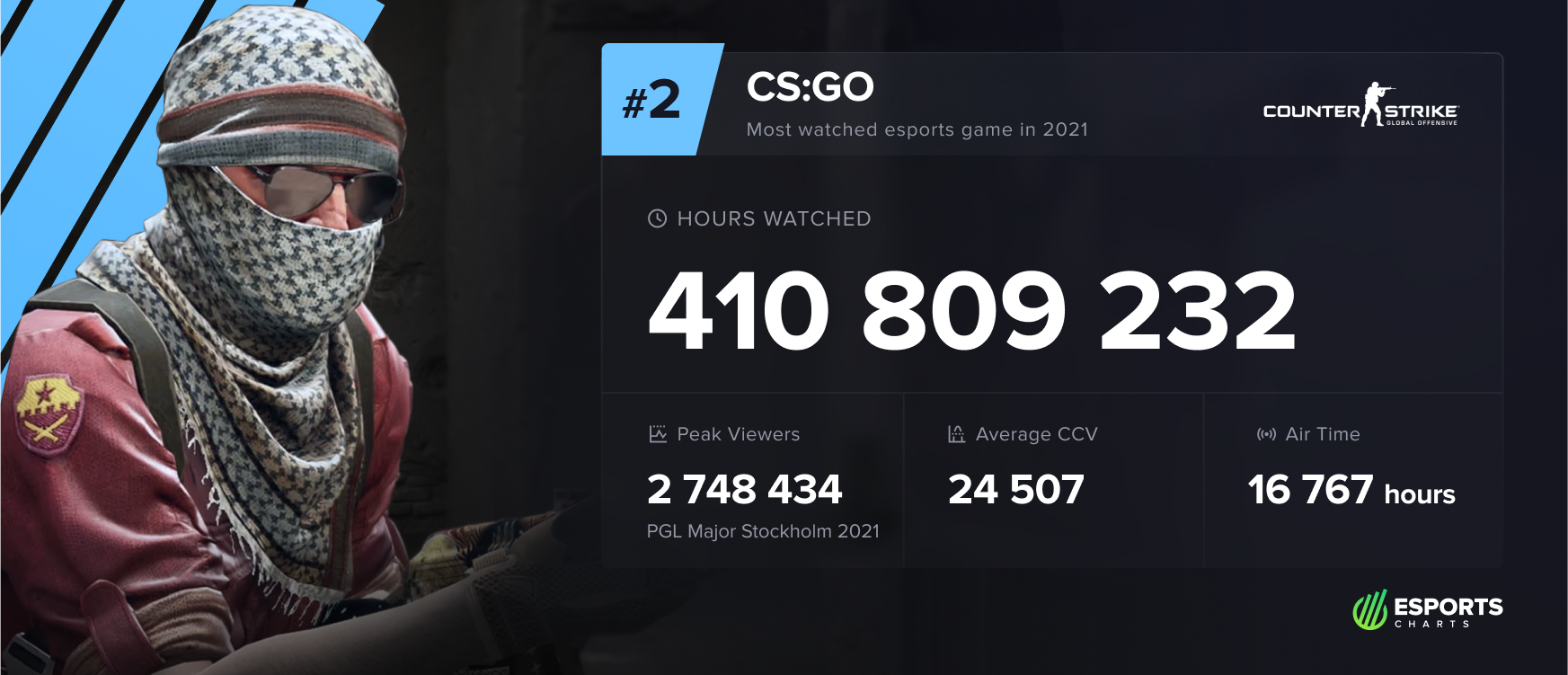 O FPS da Valve bateu recordes de espectadores em simultâneo, no PGL Major Stockholm 2021, mas não fica por aqui. O relatório apresentado pelo site indica que o CS:GO voltou a crescer em 2021, totalizando 410 milhões de horas assistidas pelas pessoas, uma diferença de 14 % face ao ano anterior.