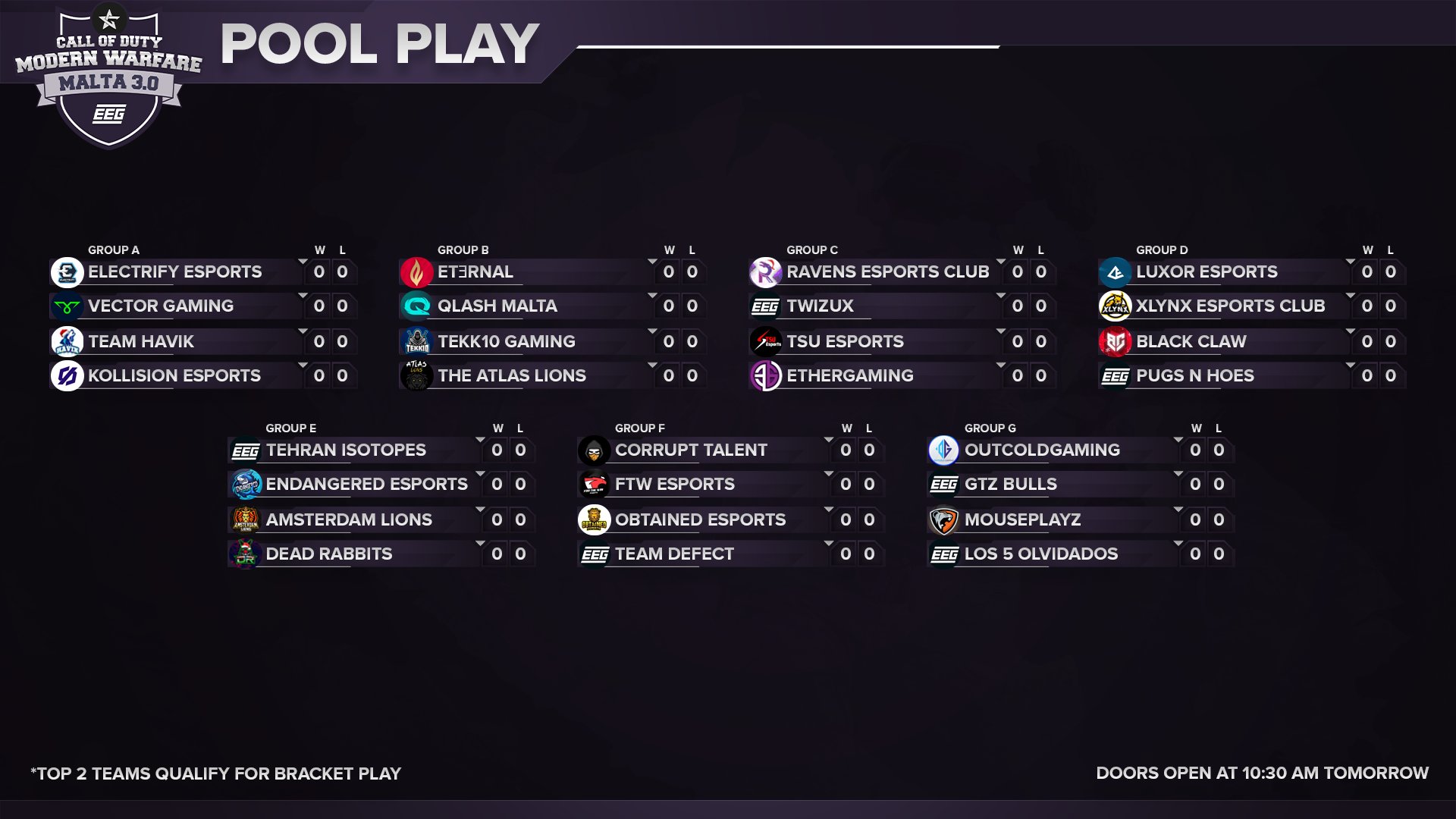 As 28 equipas foram distribuídas por 7 grupos de 4, com o Top 2 de cada grupo a avançar para as eliminatórias – os jogos irão iniciar pelas 11:00 de hoje, com FTW e GTZ a ocuparem lugares nos grupos F e G respectivamente.