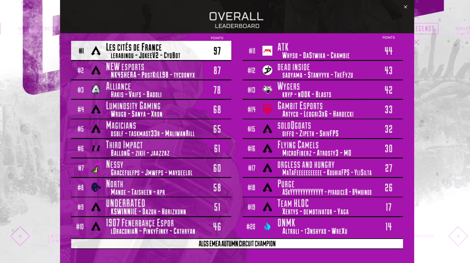 Os NEW fizeram história no Apex Legends nacional nesta noite ao tornarem-se vice-campeões das finais de Outono EMEA no Circuito ALGS, amealhando $22,500 com a sua prestação.