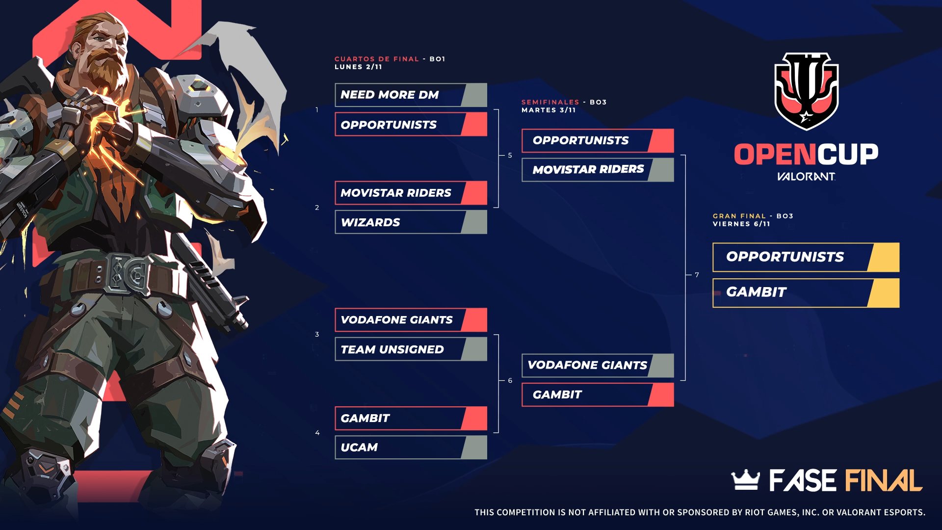 O jogo final da NGL Open Cup joga-se às 18h00 de 6 de novembro, próxima sexta-feira, entre os Opportunists e Gambit Esports. Vai haver também um jogo para definir o terceiro lugar, com horário indefinido, entre os Movistar Riders e os Giants.