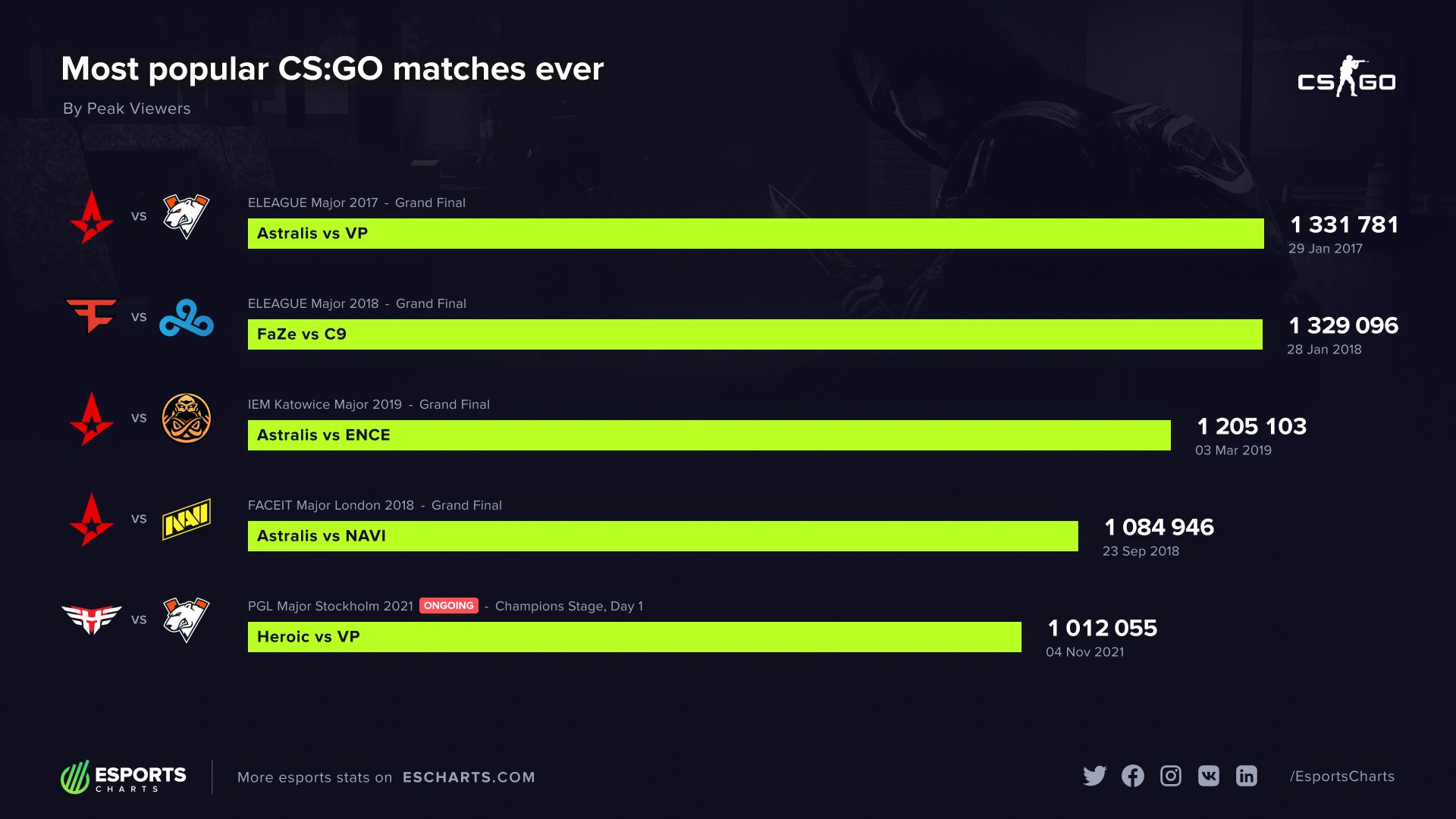 Os jogos mais vistos de sempre de CS:GO. (Imagem: Esports Charts)