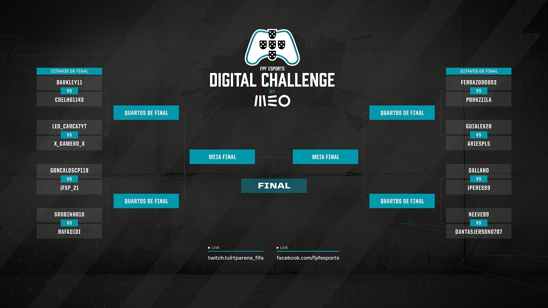 Os Playoffs do FPF Esports Digital Challenge by MEO jogam-se neste Domingo a partir das 12:00 no canal da Twitch da RTP Arena FIFA, tendo Gonçalo "BombNuker" Migueis e Alexandre "Archarom" Maia a dar voz aos jogos transmitidos.