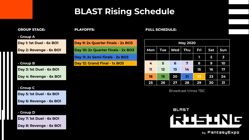 O BLAST Rising conta com 30,000€ em prémios e terá no seu formato as 16 equipas divididas por 4 grupos jogados em Round Robin BO1, havendo duas voltas dentro do grupo – as duas melhores de cada um irão avançar para a fase final disputada numa bracket de eliminação única. Em baixo, o calendário da competição pode ser consultado: