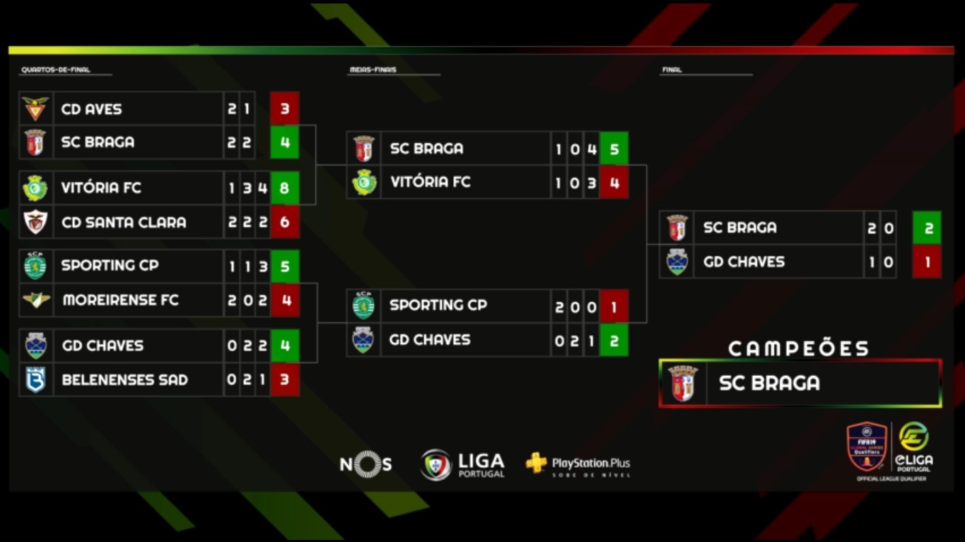 O público pediu espetáculo e os atletas não desiludiram: as meias-finais foram decididas apenas nas grandes penalidades. Após dois empates entre Braga e Vitória, os bracarenses não vacilaram na linha dos 11 metros, não falhando nenhum penalty e abrindo assim o caminho para a grande final da eLiga Portugal. Já no lado oposto da bracket, Sporting e Chaves venceram uma mão cada, ambas pelo resultado de 2-0, mas a equipa da capital não conseguiu converter nenhumas das primeiras três grandes penalidades, ditando assim o seu adeus à prova. Com as condições reunidas para uma grande final, os atletas do Braga e do Chaves entraram em campo com apenas um objetivo em mente: a taça.