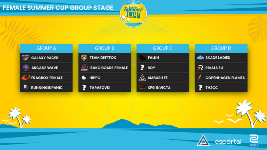 As Vodafone Giants Red onde competem Marta "D7" Asensio e Aida "Aida" Simão faziam parte da lista de equipas convidadas, acabando no entanto por ser substituída pelo conjunto que representa os Rivals. A Ambush Female Summer Cup é jogada com grupos GSL, apurando as duas melhores equipas de cada grupo para os Playoffs.