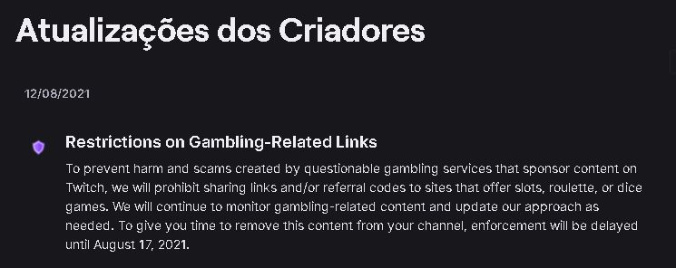 De acordo com as novas regras da Twitch, os criadores de conteúdo ficam proibidos divulgar links e códigos de parceiros para sites de jogos de azar.